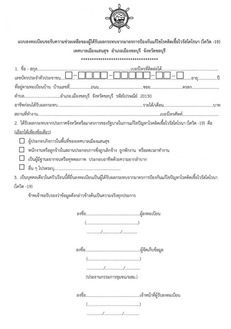1 กรอกข้อมูลโดยตรงได้ที่ คณะกรรมการชุมชน อาสาสมัครสาธารณสุขประจำหมู่บ้าน (อสม.) และเจ้าหน้าที่กองสวัสดิการสังคม เทศบาลเมืองแสนสุข