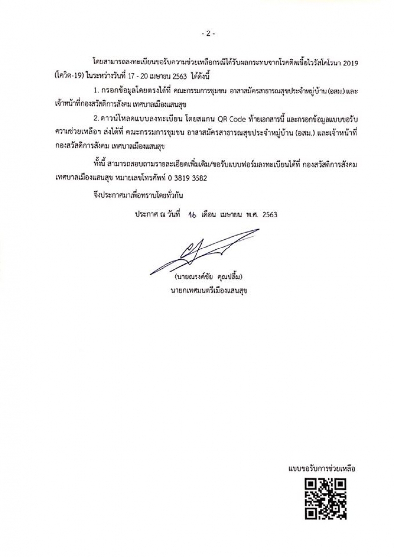 2 ดาวน์โหลดแบบลงทะเบียน โดยสแกน QR Code ท้ายเอกสาร และกรอกข้อมูลแบบขอรับความช่วยเหลือฯ