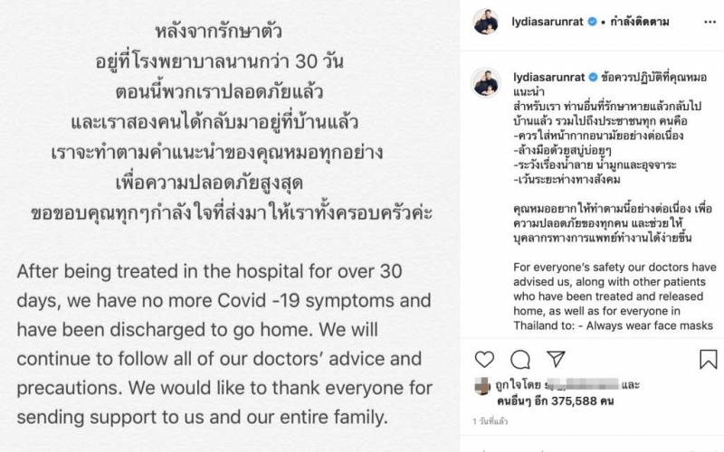 ถือเป็นเรื่องราวดีๆที่หลายคนตั้งตาคอยสำหรับ ลิเดีย ศรัณย์รัชต์ และสามี แมทธิว ดีนที่ได้กลับบ้านแล้ว หลังเข้ารับการรักษาจากการติดcovid-19 รวมเป็นระยะเวลากว่า 30 วัน