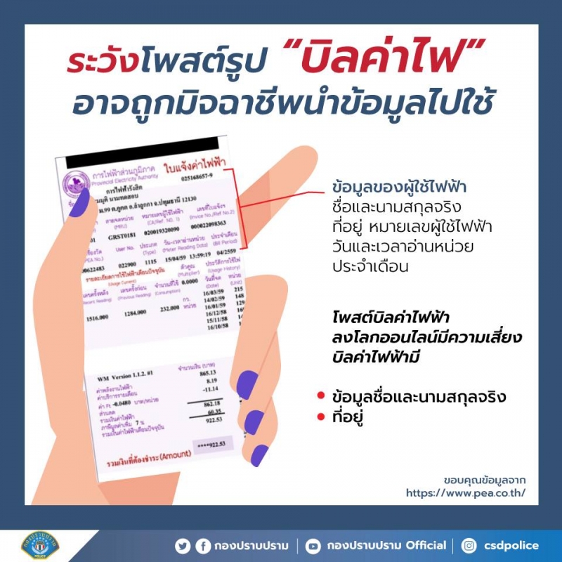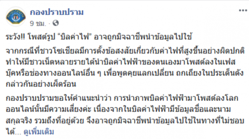 กองปราบปราม เตือน ห้ามโพสต์รูป บิลค่าไฟฟ้า