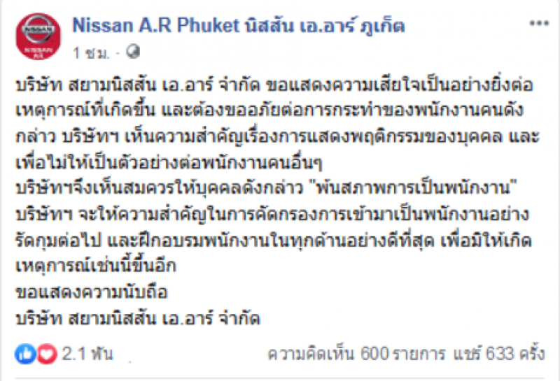 ต่อมาต้นสังกัดของผู้หญิงคนดังกล่าว ได้ออกมาโพสต์ อีกโดยได้ระบุข้อความว่า บริษัท สยามนิสสัน เอ.อาร์ จำกัด ขอแสดงความเสียใจเป็นอย่างยิ่งต่อเหตุการณ์ที่เกิดขึ้น และต้องขออภัยต่อการกระทำของพนักงานคนดังกล่าว บริษัทฯ เห็นความสำคัญเรื่องการแสดงพฤติกรรมของบุคคล และเพื่อไม่ให้เป็นตัวอย่างต่อพนักงานคนอื่นๆ