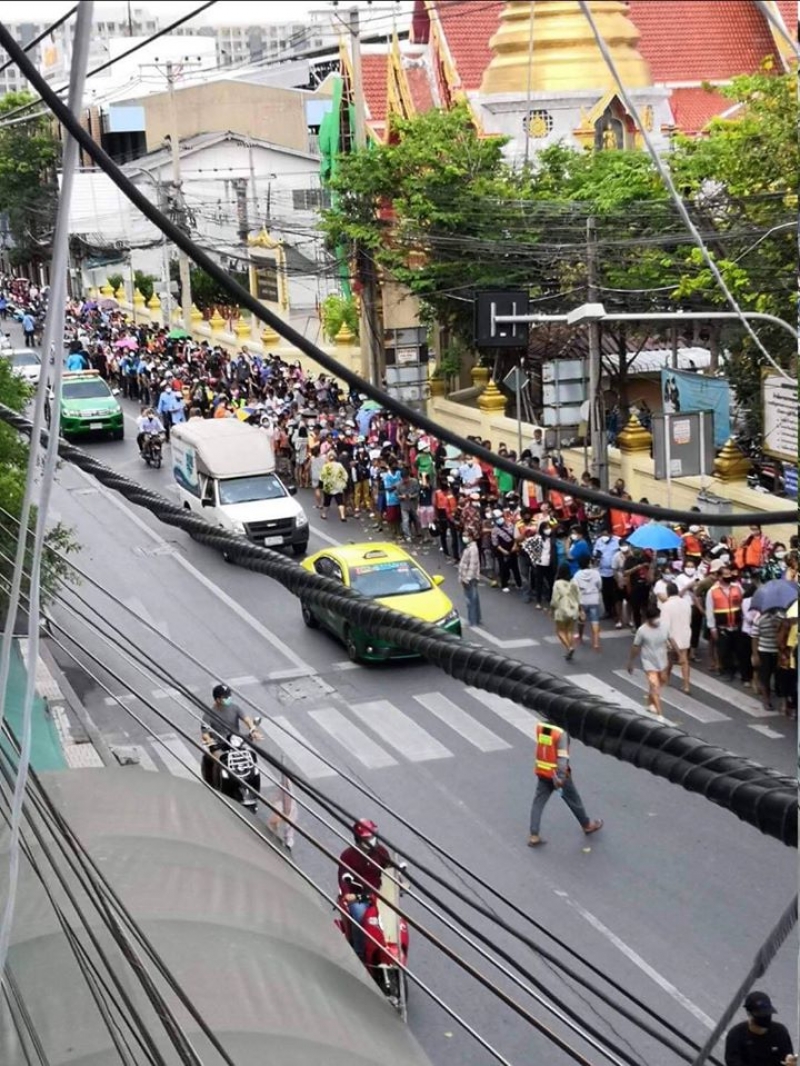 หลังมีการ แจกข้าวสารอาหารแห้งพร้อมเงิน บริเวณหน้าวัดดอนเมือง มีคนจำนวนมาก การจราจรติดขัด