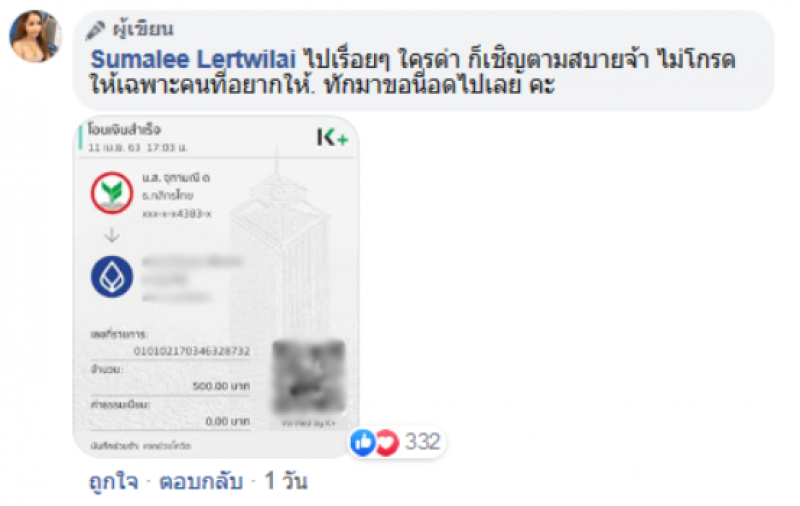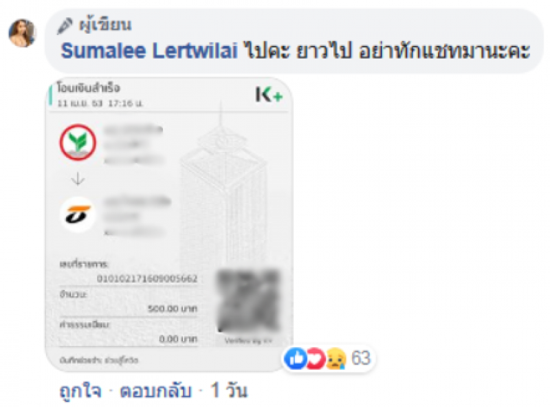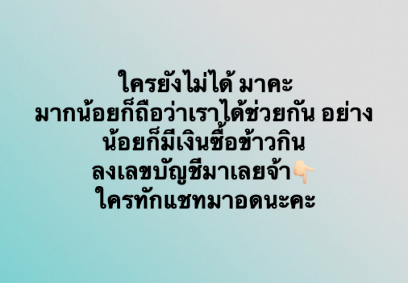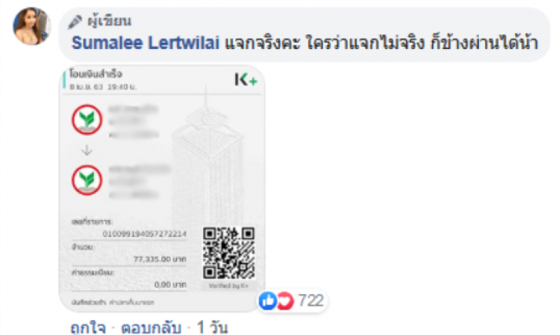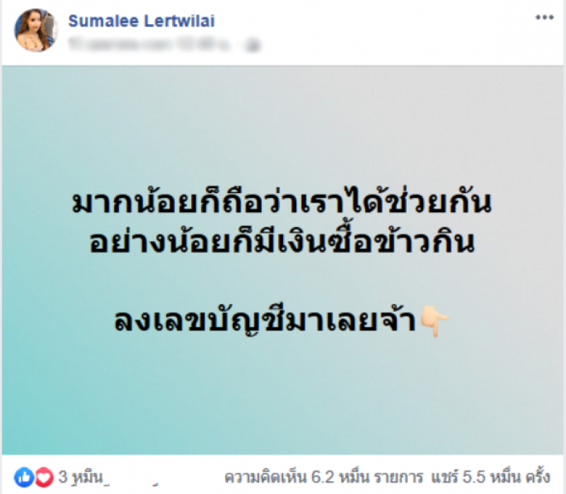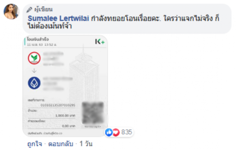เรียกได้ว่าเป็นเรื่องราวดีในช่วงวิกฤตในช่วงนี้ ที่ใครหลายคนเดือดร้อนเเละตกงานกันเป็นส่วนใหญ่ และที่ได้รับผลกระทบจากเหตุการณ์ที่เกิดขึ้นในปัจจุบัน ล่าสุดผู้ใช้เฟซบุ๊กชื่อ Sumalee Lertwilai ได้ออกมาโพสต์ตั้งเเต่เมื่อวันที่ 11 เมษายน 63 โดยได้ระบุข้อความว่ามากน้อยก็ถือว่าเราได้ช่วยกันอย่างน้อยก็มีเงินซื้อข้าวกินลงเลขบัญชีมาเลยจ้า