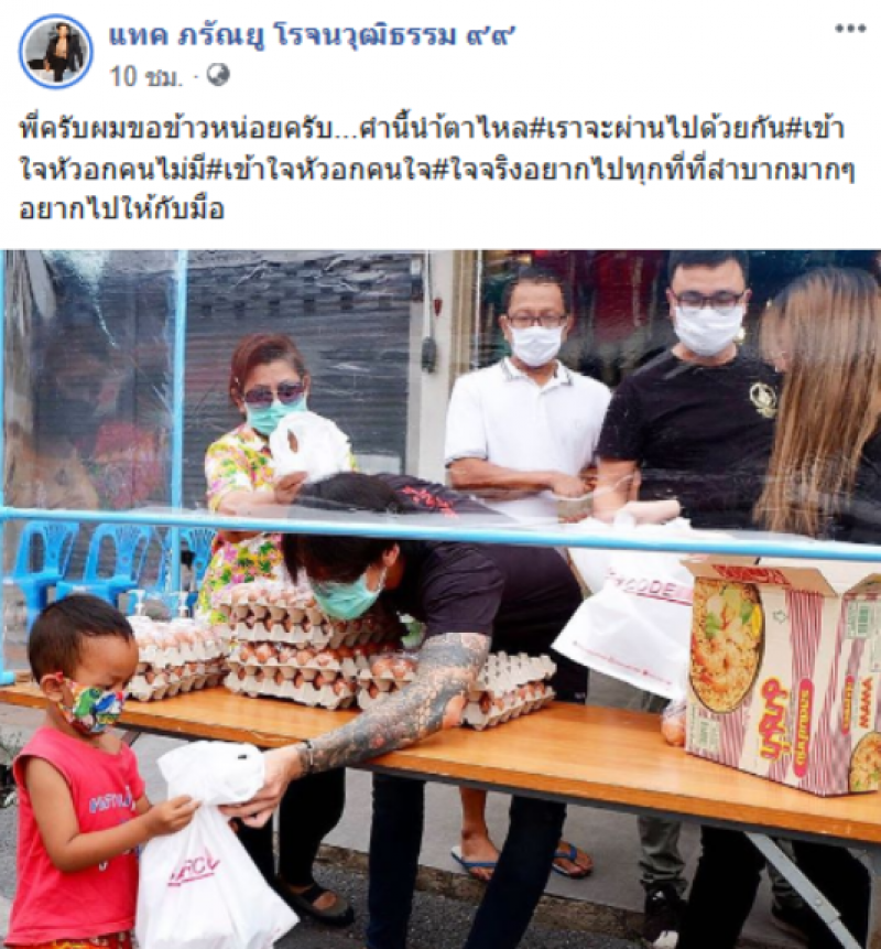 เรียกได้เป็นเรื่องราวดีที่คนดีในสังคมออกมาช่วยกัน โดยล่าสุดหนุ่ม แทค ภรัญญู ได้ตระเวน แจกข้าว น้ำ อาหาร ให้คนที่ได้รับผลกระทบจากเหตุการในปัจจุบัน ที่ทำให้หลายคนตกงาน ไร้ที่อยู่ ไร้ข้าวสารจะกรอกหม้อ โดยมีเหตุการณ์ เหตการณ์หนึ่งที่ทำให้หนุ่ม แทค ภรัญญู ถึงกับปลอ่ยโฮออกมา เมื่อได้ยินเสียงเด็ก พูดว่า พี่ครับผมขอข้าวหน่อยครับ โดยหนุ่ม แทค ได้เล่าผ่านเพจเฟซบุีกส่วนตัว โดยได้ระบุข้อความว่า พี่ครับผมขอข้าวหน่อยครับ คำนี้ทำปล่อยโฮ เราจะผ่านไปด้วยกัน เข้าใจคนไม่มี ใจจริงอยากไปทุกที่ที่ลำบากมากๆ อยากไปให้กับมือ